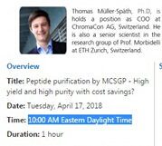 主講人:Thomas Müller-Sp?th, COO of ChromaCon 內容:Purification by MCSGP - High yield and High Purity with Cost Savings 時間:2018年4月17日,星期二,北京時間22:00(即10:00 AM Eastern Daylight Time) 時長:1小時