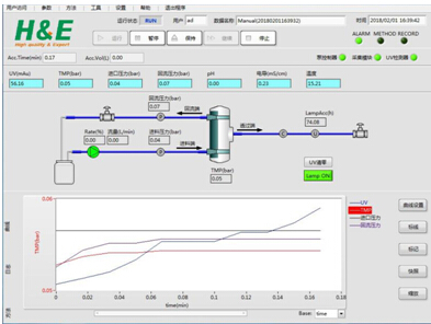 2)可設(shè)置進(jìn)料壓力、TMP及透過端UV報警值,超出范圍即停泵,防止目標(biāo)物損失,保證工藝可控性。