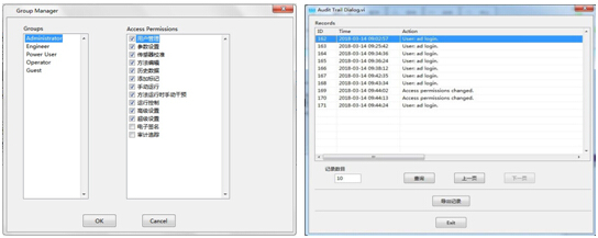 ? ? ??系統(tǒng)采用五級用戶管理權(quán)限,可對用戶權(quán)限進(jìn)行自定義分配,并可在運行中更換用戶(便于交接班)。完善的審計追蹤及電子簽名功能,符合cGMP法規(guī)要求。