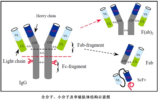 抗體的重鏈可變區(qū)以及輕鏈(VH+VL),通過(guò)一段多肽連接,形成單鏈抗體的可變區(qū)(ScFv)。穿透力強(qiáng)但往往親和力下降。分子量在~25kDa。Alexion?Pharmaceutical公司研制的Pexelizumab,主要用于治療冠狀動(dòng)脈疾病。