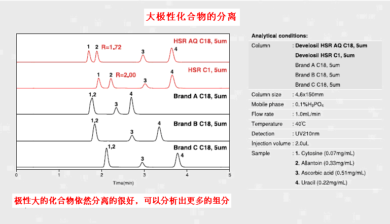 可以使保留和分離做到最大化,同時(shí)兼具耐久性和便捷性。這些特點(diǎn)可以廣泛的適用于科研研發(fā)和質(zhì)量控制。一般情況下,大極性的化合物使用HILIC模式的柱子,但是,我們可能更傾向于在分析的時(shí)候用類似的反相柱。因此,Develosil HSR AQ C18和C1柱,應(yīng)運(yùn)而生!
