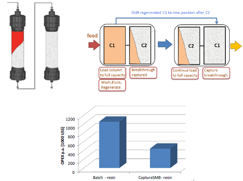 傳統(tǒng)層析工藝,由于流穿效應(yīng),有30-50%的填料是無法被完全利用的,從而使得載量和處理量大為受限。Capture SMB用于優(yōu)化捕獲環(huán)節(jié),作為最簡單和最強大的2柱位設(shè)計,可使純化效率顯著提高,并且使填料用量大為縮減。