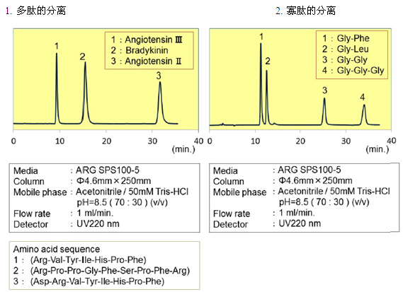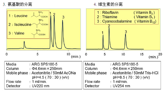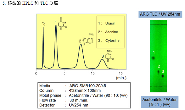 親水化合物一般是用反相模式來進行分離,例如使用C18填料。但是,仍然有很多親水的化合物不能用普通的反相模式來分離。近些年來,HILIC模式的填料應運而生,特別適合分離親水性化合物(極性大的化合物)。富士硅化學有限公司開發了HILIC模式的“ARG硅膠”。ARG硅膠可用于分離氨基酸、多肽、維生素和核酸。不同粒徑的ARG硅膠可分別應用于分析以及大規模的分離純化。