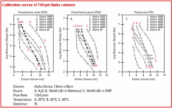TSKgel Alpha色譜柱是專為中間極性聚合物的GPC分析所開發的產品。與PW和PWxl型色譜柱一樣,TSKgel Alpha色譜柱內的填料顆粒也具有羥基化甲基丙烯酸聚合物骨架,不過其交聯度卻高于PW和PWxl型色譜柱,從而可以將填料在極性有機溶劑中的溶脹減小到最低。它非常適合于在甲醇、乙醇、DMF、THF、HFIP、DMSO、2-丙醇和乙腈等極性有機溶劑體系下進行分析聚合物。