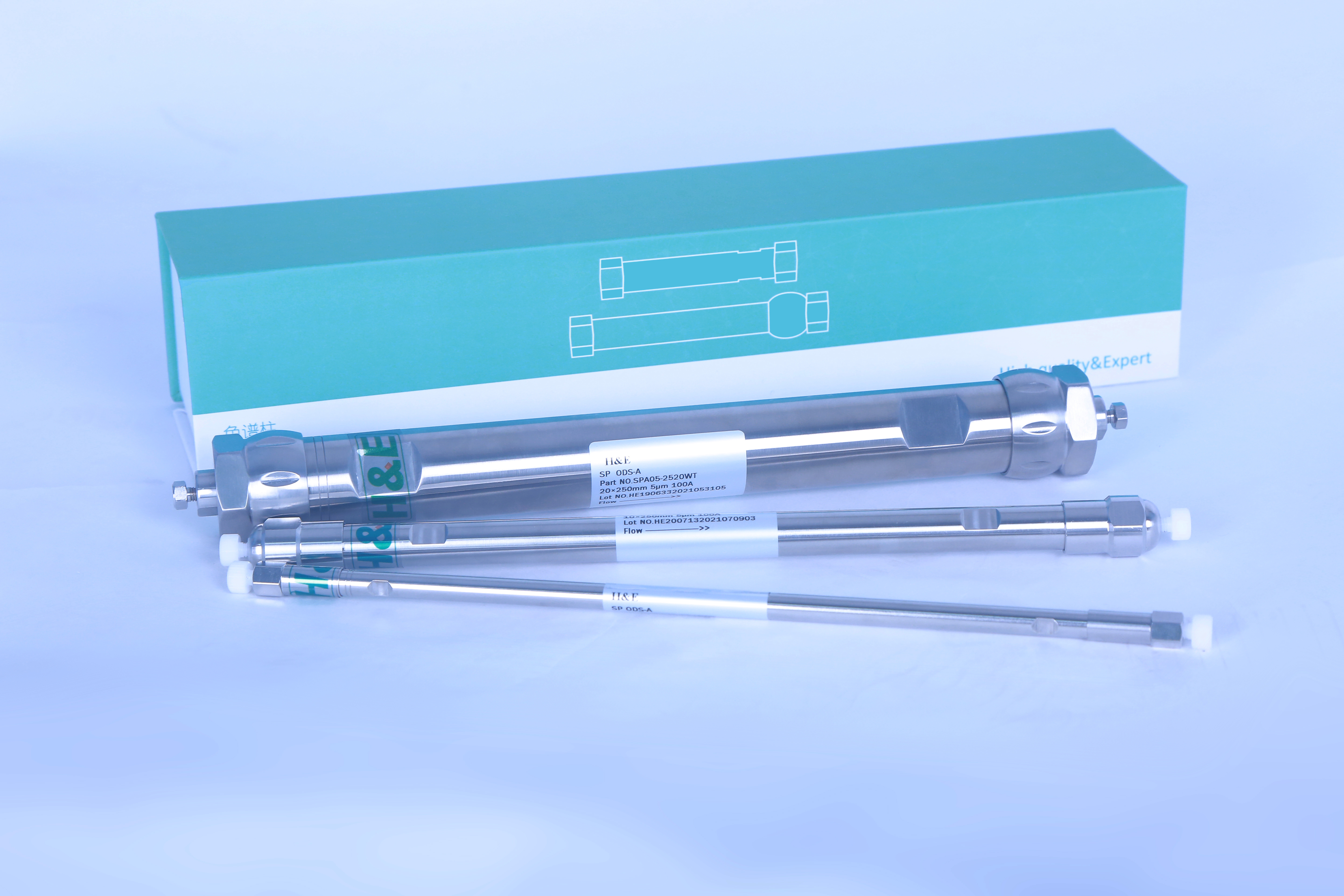 H&E SP ODS-TA系列液相色譜柱通過改進的硅膠和三鍵鍵合技術,有效防止堿性溶液對硅膠基質的破壞,從而能夠確保您的色譜柱即使在最嚴苛的工作條件下也能有最佳的性能及最長的使用壽命,因此色譜柱可在高pH下使用。 可為堿性化合物提供良好的峰形,并且對堿性化合物有極高的載樣量,非常適合堿性化合物的制備分離。