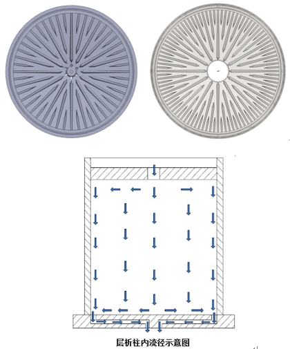 分配器按照現(xiàn)代機械設(shè)計先進理念進行的,流體動態(tài)仿真、優(yōu)化設(shè)計、可靠性設(shè)計、虛擬設(shè)計、三維造型、產(chǎn)品全壽命周期設(shè)計,使得產(chǎn)品性能得到有一種單一的中央噴口和一種徑向?qū)Я鞑邸7乐眹姷膰娍谂c導流槽做在了一起,定位在每個單元的中心,防止噴出的液體直接進入柱管而不通過分配器。獨特的分配器設(shè)計,保證所有流徑長度相同,從而更有效地保證分配效果。