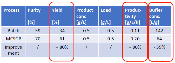 MCSGP可將產品純度從傳統工藝的59%提升至70%,將收率從傳統工藝的34%提升至61%,從而使產量(g /L /h)整體提升80%,并同時使Buffer的消耗量降低55%MCSGP工藝,無疑可顯著地節約成本投入,并可產生更多的生產效益。