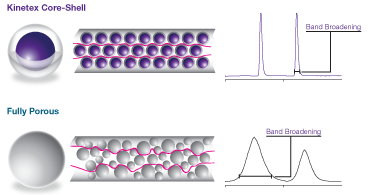 核-殼技術(shù)的奧秘在于核-殼顆粒的形狀。一致的多孔硅膠層圍繞著球形實(shí)心硅膠核生成:使用包含納米結(jié)構(gòu)技術(shù)的溶膠凝膠處理技術(shù),在固態(tài)硅膠核上培養(yǎng)出均一穩(wěn)定的多孔外殼,形成核-殼顆粒。該顆粒形態(tài)會產(chǎn)生比全多孔顆粒更小的譜帶展寬,從而帶來極高的柱效。