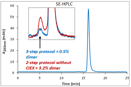 ? ? ? ?最終產(chǎn)品經(jīng)SE-HPLC檢測(cè),純度高達(dá)99.5%,二聚體含量?jī)H為0.5%,比Protein A - Desalting兩步層析所得產(chǎn)品的二聚體含量降低近6倍,該產(chǎn)品可直接用于氨基酸序列測(cè)定、二硫鍵測(cè)定以及糖型分析等高純度要求的檢測(cè)。