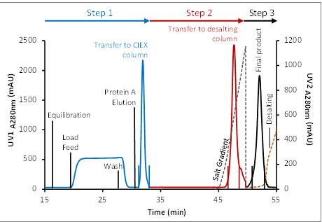 ? ? ? ?在該過(guò)程中,Protein A的洗脫組分經(jīng)過(guò)在線稀釋?zhuān)苯由蠘又罜IEX層析柱,CIEX進(jìn)行線性洗脫,去除降解物及聚集體,將目標(biāo)組分直接上樣至脫鹽柱。三步層析緊密銜接,前一步層析的洗脫與后一步層析的上樣同時(shí)進(jìn)行,使得純化效率顯著提高。