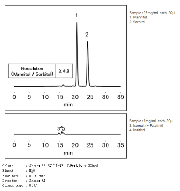 歐洲藥典EP和日本藥典JP規(guī)定,分析甘露醇使用Ca型強陽離子交換柱,色譜柱尺寸7.8*300mm,甘露醇與山梨醇的分離度達到2以上。同樣對應Shodex SUGAR SC1011-7F,能夠符合歐洲藥典/日本藥典的要求。